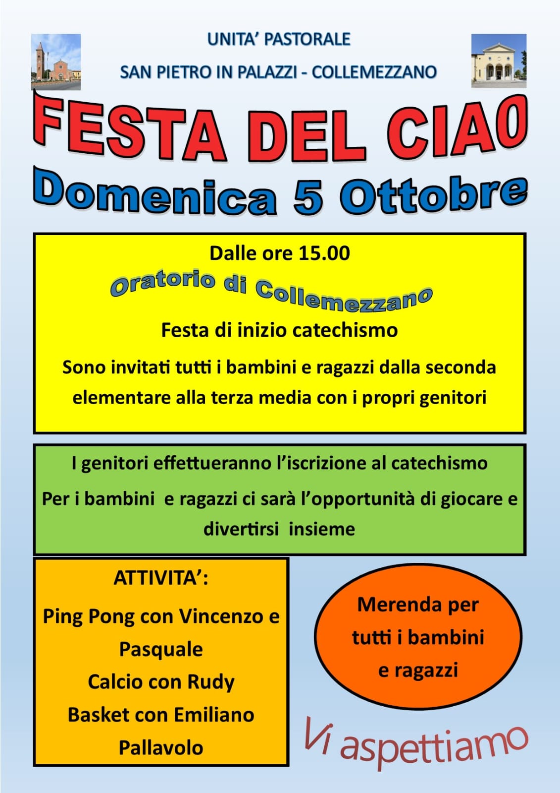 Domenica 5 ottobre, dalle ore 15:00, l’Oratorio di Collemezzano apre le sue porte a bambini, ragazzi e genitori per dare il via al nuovo anno catechistico con la tradizionale Festa del Ciao. Un’occasione speciale per ritrovarsi, conoscersi e vivere insieme un pomeriggio di gioia e condivisione.