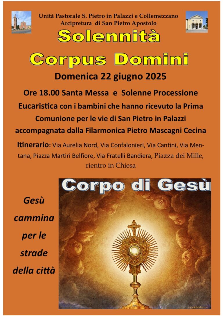 Domenica 22 giugno, la comunità dell’Unità Pastorale di San Pietro in Palazzi e Collemezzano si riunisce per celebrare la Solennità del Corpus Domini, un momento di fede profonda e di testimonianza pubblica. 📍 Ore 18.00: Santa Messa presso la chiesa di San Pietro, seguita dalla solenne processione eucaristica con i bambini che hanno ricevuto la …